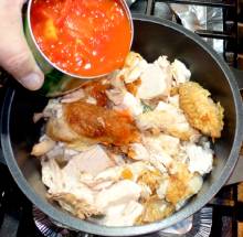 | Соус Ткемали, белое вино, сливочное масло, помидоры консервированные, уцхо-сунели (хмели-сунели), паприка, чеснок. | Небольшие куски курицы выкладываются в кастрюлю, последовательно добавляются белое вино, консервированные помидоры, томленый лук, соус ткемали, специи и блюдо тушится в собственном соку 10-15 минут, а затем заправляется чесноком и зеленью. |