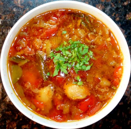 Краткое описание: Варится бараний бульон, процеживается, в него выкладывается овощная зажарка (жареный лук, сладкий перец, консервированные томаты), солёные огурцы, а в конце варки - консервированная фасоль. Суп заправляется чесноком, толченым с солью. При подаче в тарелки выкладывается нарезанное кубиками мясо из бульона, суп заправляется свежей зеленью.