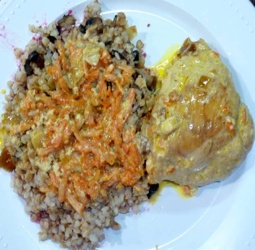Краткое описание: Куриные бёдра обжариваются на смеси сливочного и растительного масла, затем тушатся до готовности в сливочном соусе (сливки, тушеная морковь, жареный лук, мука, чеснок, горчица, соль, перец).
