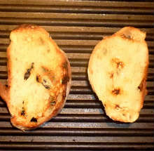 Сбрызнуть ломтики багета оливковым маслом, выложить на разогретую сковороду-гриль.