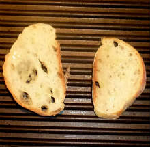 Сбрызнуть ломтики багета оливковым маслом, выложить на разогретую сковороду-гриль.