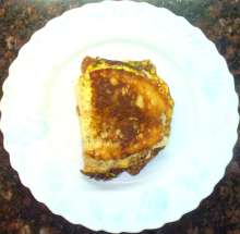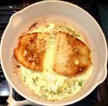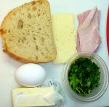 Комбинация омлета и тоста Ломти хлеба поджариваются с двух сторон на сливочном масле до легкой корочки, выкладываются на схватившийся омлет. По готовности омлет вместе с ломтями хлеба переворачивается, на один из ломтей выкладываются ломтики ветчины и сыра, ломти складываются так, чтобы они оказались точно один над другим. В середине окажется начинка с омлетом.