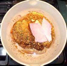Переложить ингредиенты назад в сковороду омлетом вверх. На половину омлета, что над одним из ломтей хлеба, выложить ломтик ветчины.