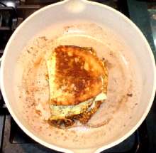Поджарить хлеб до золотистой корочки, перевернуть, обжарить с другой стороны, убрать со сковороды.