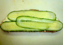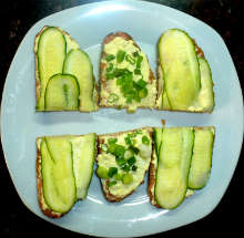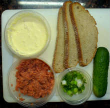 Соленые лососевые брюшки Лососевые брюшки перемалываются в блендере и наносятся на поджаренный хлеб, намазанный маслом. Следующим слоем намазывается смесь рубленных яиц, тертого сыра, сметаны и майонеза, а третьим слоем - тонко нарезанные ломтики свежих огурцов или зеленый лук.