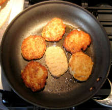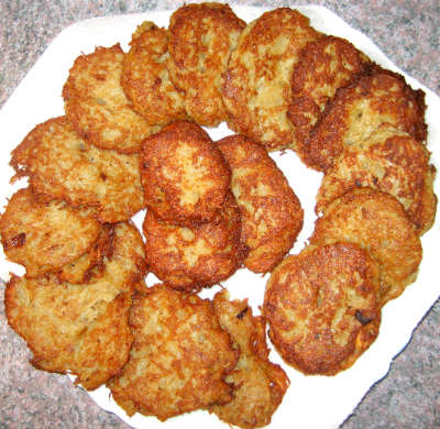 Масла для жарки требуется много (слой примерно 3мм), но его остатки убираются, когда латкес выкладываются на бумажную салфетку.