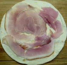На лаваш выложить слоем ветчину.