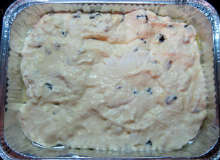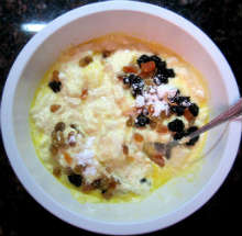Манная крупа, сушеные ягоды Творог смешивается с предварительно замоченной манной крупой, запаренными сушеными ягодами, взбитыми яйцами, сахаром, солью и запекается в духовке.