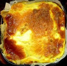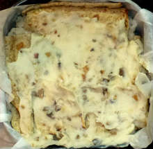 Лаваш Грибы обжариваются с жареным луком и добавляются в картофельное пюре вместе с обжаренным беконом. Начинка заворачивается трубочками в несколько прямоугольников из лаваша. Трубочки лаваша с начинкой укладываются в форму для запекания и заливаются яично-сметанной смесью с тертым сыром. Пирог выпекается при 180 С 35 минут.