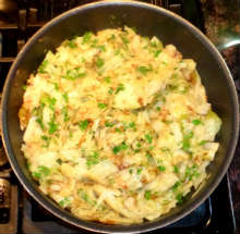 Капусту нарезать соломкой, выложить на нагретую сковороду с растительным маслом. Поджарить на сильном огне до легкой корочки.