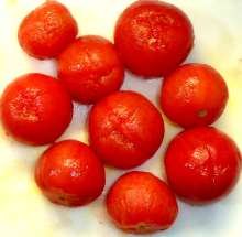 Тем временем залить помидоры кипятком, подержать 3 минуты, переложить в ледяную воду, очистить помидоры от кожицы.