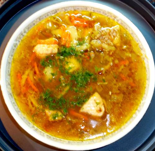 Суп с оригинальным вкусом, который обеспечивают рыба в сочетании с солёными огурцами и гречкой. Сочетание необычное для рассольника, но суп очень вкусный.