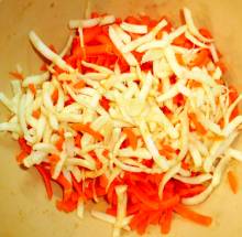 Рассол слить, рыбу залить кипятком. Помешать, чтобы стороны всех кубиков равномерно побелели. Слить кипяток.
