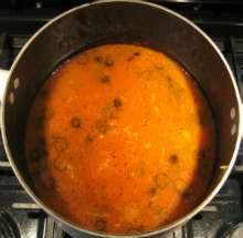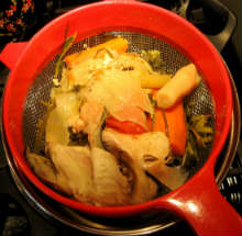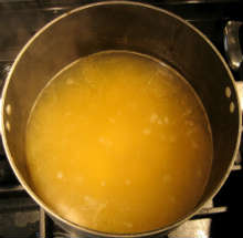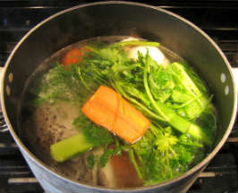 Добавить овощи, и специи. проварить бульон несколько часов на малом огне.