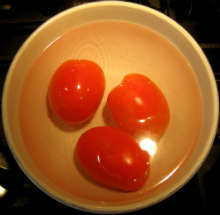 Пока бульон варится, залить помидоры кипятком, снять шкурку, нарезать мелкими кубиками.