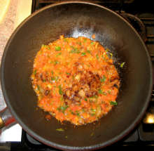 Выложить сельдерей и зелень в сковороду, затем добавить жареный лук.