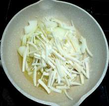 В базовом рецепте грибы сначала отвариваются, а затем вынимаются и режутся соломкой. Я не вижу в этом смысла – после замачивания грибы спокойно можно нарезать, зачем вылавливать их из кастрюли?
