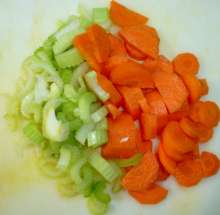 Морковь нарезать кружочками, стебель сельдерея – брусочками.