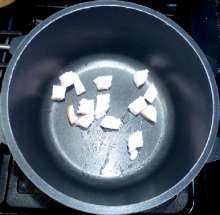С ветчины срезать жир, нарезать кубиками, выложить в разогретую толстостенную кастрюлю.