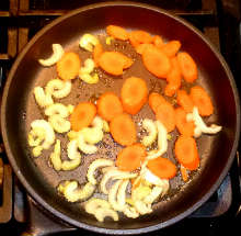 Раскалить сковороду с ложкой кунжутного масла, выложить нарезанные овощи.