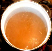 Подготовить исходные ингредиенты. Если бульона нет - сварить (см. как). Нужное количество бульона вылить в кастрюлю и нагреть до кипения.