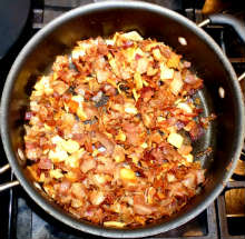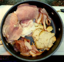 У меня это - остатки предыдущих праздников, хранящиеся в морозилке. Да, вид не очень опрятный, но на вкус это не влияет.Выложить копчености в разогретую сковороду.