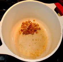 Поджарить бекон до корочки на малом огне, чтобы вытопился жир.