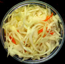 Подготовить квашеную капусту. Если очень кислая - промыть и отжать. Если нашинкована длинно - порезать.