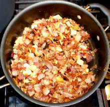Вынуть поджаренный бекон, в казан выложить лук.