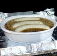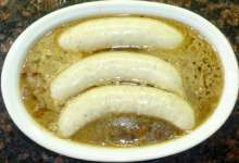 | Пиво, сахар, жареный лук. | В форму для запекания наливается луковая подливка (пассерованный с сахаром лук со специями, тушеный в мясном бульоне с добавлением муки), поверх выкладываются колбаски, доливается светлое пиво и блюдо запекается 35 минут при 200 С. |
