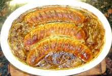 Колбаски с жареным луком в пивной подливке (Польская кухня)