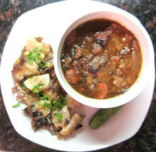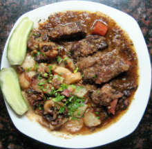 | Красное сухое вино, грибы | Предварительно замаринованная в красном вине говядина тушится с обжаренными овощами и грибами в соусе из красного вина и говяжьего бульона. |