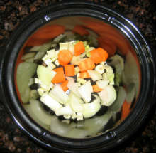 Следующим слоем выложить обжаренные морковь и сельдерей. Залить ингредиенты процеженным маринадом, добавить говяжий бульон.