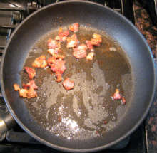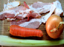 Аутентичные рецепты в большинстве содержат маленькие луковички (типа сеянца), а не нормальный репчатый лук. Если такие луковички есть - резать их не надо.На тяжелой сковороде с высокими бортами поджарить кусочки бекона до румяной корочки и удалить из сковороды. Если вытопленного жира недостаточно - добавить сливочного масла.
