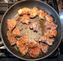 Запанировать мясо в муке. Лучше всего это сделать в пакете, выложив туда муку и мясо и энергично встряхнув.