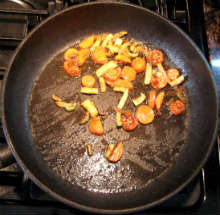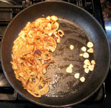 Добавить порезанный пластинками чеснок, слегка подрумянить, выложить лук и чеснок со сковороды.