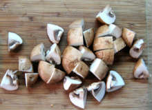У грибов отрезать ножки, шляпки нарезать на крупные куски.