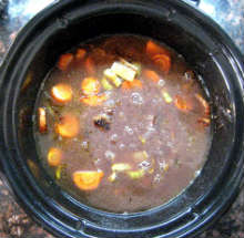 Следующим слоем выложить обжаренные морковь и сельдерей. Залить ингредиенты процеженным маринадом, добавить говяжий бульон.