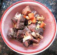Красное сухое вино, грибы Предварительно замаринованная в красном вине говядина тушится с обжаренными овощами и грибами в соусе из красного вина и говяжьего бульона.
