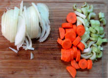 Лук нарезать полукольцами, морковь - полукружьями, сельдерей - поперек волокон.