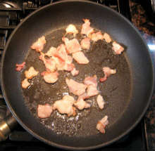 На тяжелой сковороде с высокими бортами поджарить кусочки бекона до румяной корочки и удалить из сковороды. Если вытопленного жира недостаточно - добавить сливочного масла.