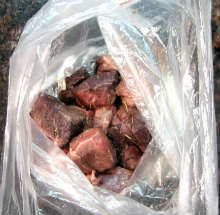 Запанировать мясо в муке. Лучше всего это сделать в пакете, выложив туда муку и мясо и энергично встряхнув.