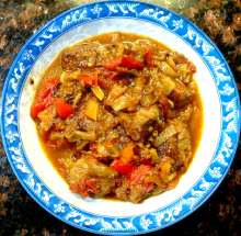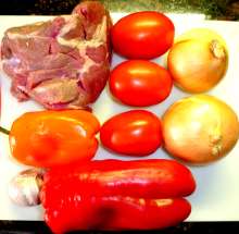 | Болгарский перец. | Крупные куски баранины обжариваются в казане на оливковом масле до золотистой корочки, затем тушатся почти до готовности. Затем к мясу добавляется лук, обжаренный вместе с чесноком, и обжаренный болгарский перец с помидорами. Блюдо тушится 20 минут и снимается с огня. |