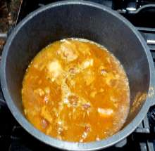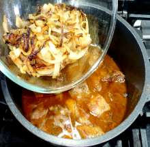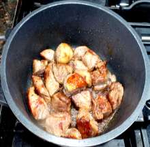 Долить кипятка так, чтобы жидкость покрывала мясо. Тушить на малом огне почти до готовности (около часа).