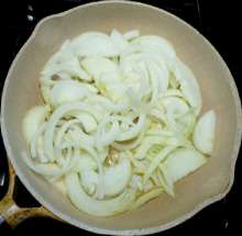 Тем временем подготовить зажарку. Лук нарезать полукольцами.