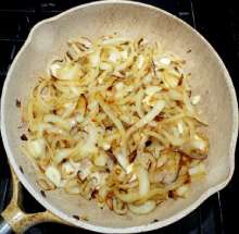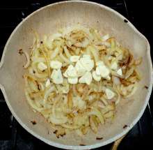 В это время уместно добавить колечки жгучего перца по вашему вкусу.В оригинальном рецепте чеснок обжаривается вместе с луком, но он жарится значительно быстрее лука и может сгореть в то время, как лук ещё не будет готов.