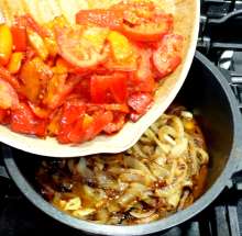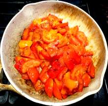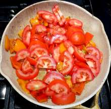 В оригинальном рецепте помидоры выкладываются одновременно с перцем, но предварительная обжарка перца интенсифицирует вкус блюда.