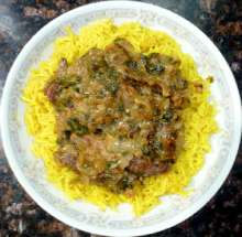 Изумительно нежное и ароматное мясо. Особенность - мясо тушится с луком без добавления воды. Аромат достигается за счет использования Сванской соли и большого количества кинзы. Готовится просто, испортить трудно.