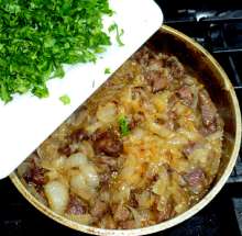 Изумительно нежное и ароматное мясо. Особенность - мясо тушится с луком без добавления воды. Аромат достигается за счет использования Сванской соли и большого количества кинзы. Готовится просто, испортить трудно.