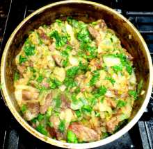 | Сванская соль, кинза. | Мясо, нарезанное брусочками, обжаривается в растительном масле, добавляется лук, блюдо тушится без добавления воды до мягкости лука, добавляется зелень, сванская соль, чеснок, блюдо тушится до изменения цвета зелени. Подается с рисом, отваренным в бульоне с имеретинским шафраном или куркумой. |
